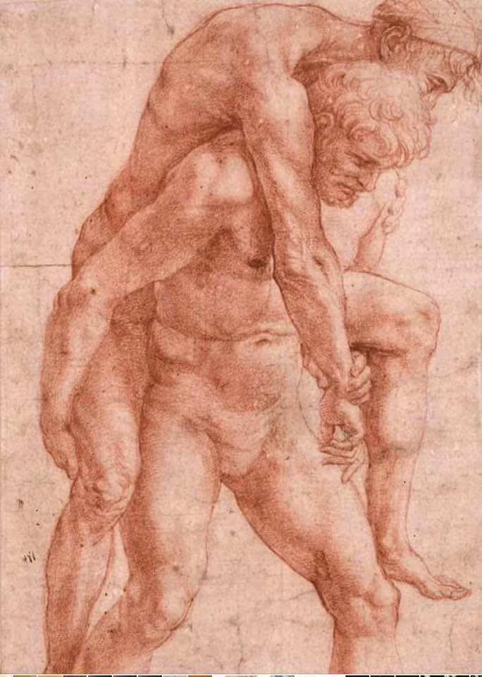 לפנינו רישום מופלא שיצר רפאל ( 1483-1520) בשנת 1513 כעבודת הכנה לקראת תיאור פרט אחד ביצירת פרסקו ענקי שתיכנן . הרישום שנוצר בגיר אדום על גבי ניר קשיח הוא בגודל 90 על 60 ס״מ ונקרא : ״ עלם צעיר נושא על גבו אדם קשיש ״ – האלמנט נכלל בסוף תהליך ההכנה והעבודה בשנת 1514 , בחלקו השמאלי התחתון של פרסקו קשתי ענקי שרוחבו 6.70 מטרים וגובהו בשיא הקשת : 4.5 מטרים . הפרסקו היווה מקטע בשורה של הזמנות עבודה גדולות שקיבל ענק הרינסאנס הצעיר משני אפיפיורים שהיו לפטרוניו בזה אחר זה בין השנים 1508 ועד מותו בשנת 1520 בעיר הותיקן שברומא . יצירת רישומים בגיר אדום היתה חביבה על רפאל באותה תקופה והוא נקט בדרך דומה גם כשיצר סדרה גדולה של רישומי לימוד וסקיצות בנושא : ״גוף האדם ״ – גבר ואישה – כדי לשפר את הבנתו באנטומיה ולתרגל תצוגה נאותה בעיניו של שרירי ופרקי הגוף האנושי בציורים מעודנים . מרבית רישומי הסדרה , כמו גם רישום ההכנה לפרסקו המפורסם שנקרא : ״ האש בבורגו ״ – מוצגים באופן קבוע במוזיאון ה ״ אלברטינה ״ , וינה . הרישום שלפנינו הוא בין הנערצים והנחשבים ביותר של רפאל במסגרת האוסף המכובד של עבודותיו המוצגות בגלריה האוסטרית ודי בזכותו , כמושך קהל רב , נחשב ה " אלברטינה " לאחד מהמוזיאונים הטובים ביותר להערכת יכולות הרישום הנדירות של רפאל הגדול . המאסטרים של הרינסאנס הגבוה נהגו להשתמש ברישומי גיר כדי לחדד את הדיוק האנטומי בציוריהם ולמרות שפעמים רבות – מדובר במחקרי לימוד ( STUDY'S ) – הם נחשבים כיום לבעלי ערך אמנותי רב . בעשרים השנים האחרונות מתחרים ביניהם המוזיאונים הגדולים והנחשבים ביותר בעולם על הזכות להציג אצלם תערוכות המוקדשות אך ורק לרישומי ההכנה שהותירו אחריהם שלושת הארכי – מאסטרים של הרינסאנס : לאונרדו דה וינצ'י, מיכלאנג'לו ורפאל – שלעתים נקראים : " הטריניטי של הרינסאנס הגבוה " . מעבר לנוכחותו השגרתית הקבועה של הרישום בו אנו עוסקים היום – ב " אלברטינה " – הוא כיכב בין ה 1/6/2017 וה 3/9/2017 בתערוכה אקדמית גדולה וחשובה ביותר של : " רישומי רפאל " שהתקיימה במוזיאון ה " אשמוליאן " שליד אוניברסיטת אוקספורד , אנגליה . באודיטוריום של האוניברסיטה נערך סמינר מיוחד שהוקדש לרישום הזה ולפרסקו שבו שולב . בין היתר , יוחסה בסמינר הזה עובדת הרגישות היתרה של רפאל בתיאוריו המעודנים לפרטי פרטיהם – הן בסגנון הצגת גופי גברים ממש כמו שנהג בפורטרטים הנשיים שלו – לכך שרפאל איבד את אמו , מאגיה ( מאיה ) די באטיסטה די ניקולה קיארלה בשנת 1491, כשהיה בן 8 בלבד , וחונך וטופח על ידי אביו , ג'יובני סאנטי , אדם רגיש ועדין במיוחד, שכיהן כמשורר וכצייר החצר של הדוכס של אורבינו . רפאל עבר לרומא בשנת 1508 , כשהוא בן 25 , כשהוזמן על ידי האפיפיור יוליוס ה 2 ( 1443-1513 ) שלא מכבר ( בשנת 1503 ) החל לכהן בתפקידו . יוליוס ה 2 נודע כפטרון גדול של אמנות והוא צירף את רפאל לעבודות הנרחבות כשהחליט לעסוק בהשלמת בנייתה של בזיליקת פטרוס הקדוש שבלב עיר הותיקן . על רפאל הוטל – בין היתר – לתכנן , לעצב וליצור את " חדרי רפאל " ( כך הם מכונים בימינו ) – 4 אולמות שהיוו ביחד את סויטת הכניסה לארמון האפוסטולי שכיום מהווה אגף נכבד במוזיאוני הותיקן . במרץ 1513 מת האפיפיור , וליורשו מונה – הקרדינל ג'יובני די לורנצו דה מדיצ'י ( 1475 – 1521 ) שהפך לאפיפיור לאו ה 10 . האפיפיור החדש כיבד מאוד את רפאל , חידש את חוזה העבודה שלו – ועד מהרה – כשבתחילת שנת 1514, מת האדריכל הראשי של פרוייקט הותיקן , דונטו ברמנטה ( 1444-1514 ) – מונה רפאל עצמו על ידי האפיפיור למשרת האדריכל החדש של כנסיית פטרוס הקדוש . בתוקף תפקידו הנרחב החדש – החל רפאל להתמקד בתיכנון העבודות ונעזר בתלמידיו ועוזריו המצויינים ביותר לביצוע חלק מהותי יותר בעבודות עצמן . במקרה שלפנינו , פנה האפיפיור לאו ה 10 באופן אישי – מיוחד , לרפאל – וביקש ממנו לחדש את אחד מציורי הקיר הענקיים שבאולם מספר 2 ב " סטאנצה " ( " חדרי רפאל " ) כדי שיכלול מעתה את סיפורו של האפיפיור האגדי לאו ה 4 ( 790-855 ) והנס שחולל בכו